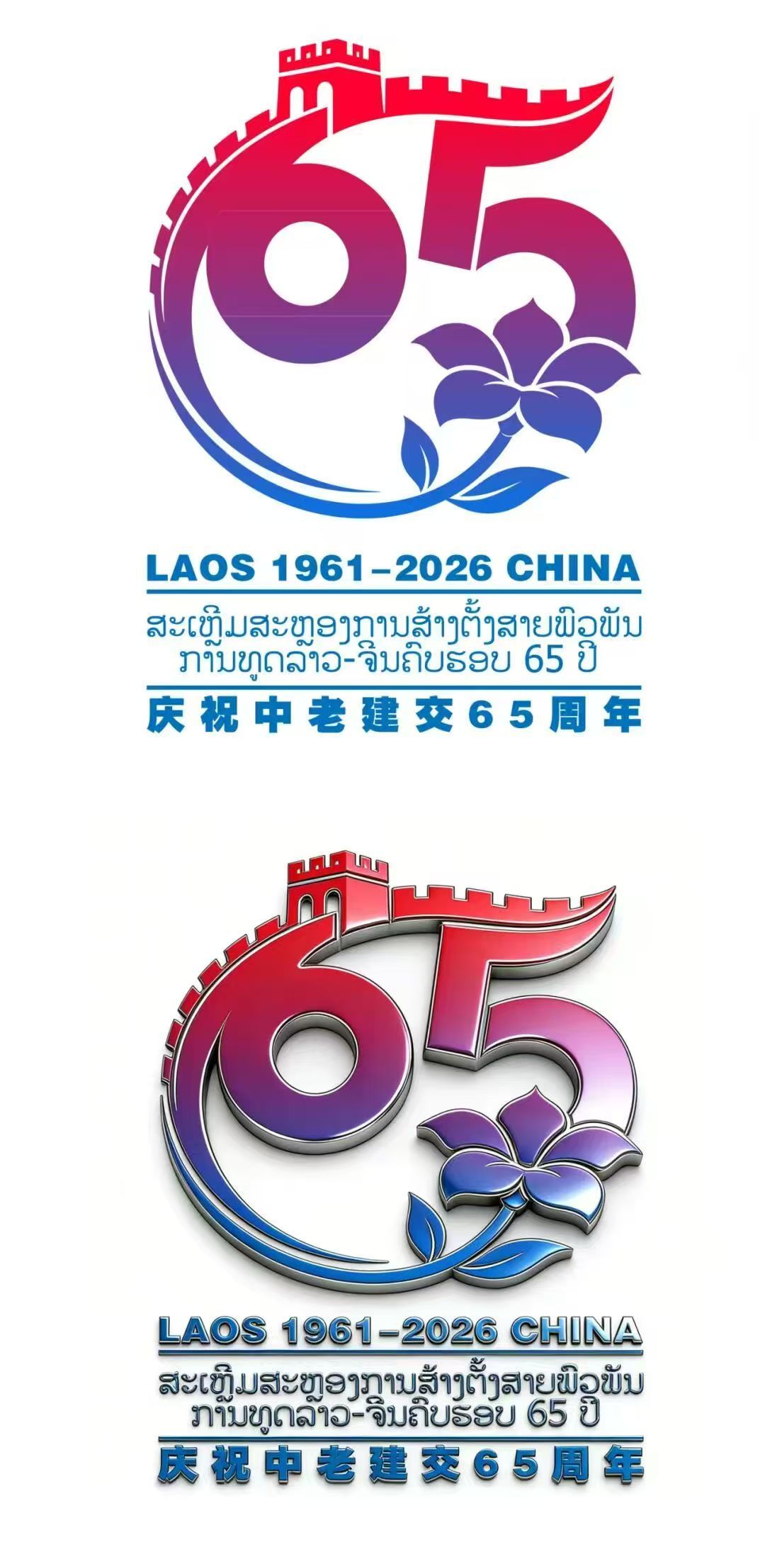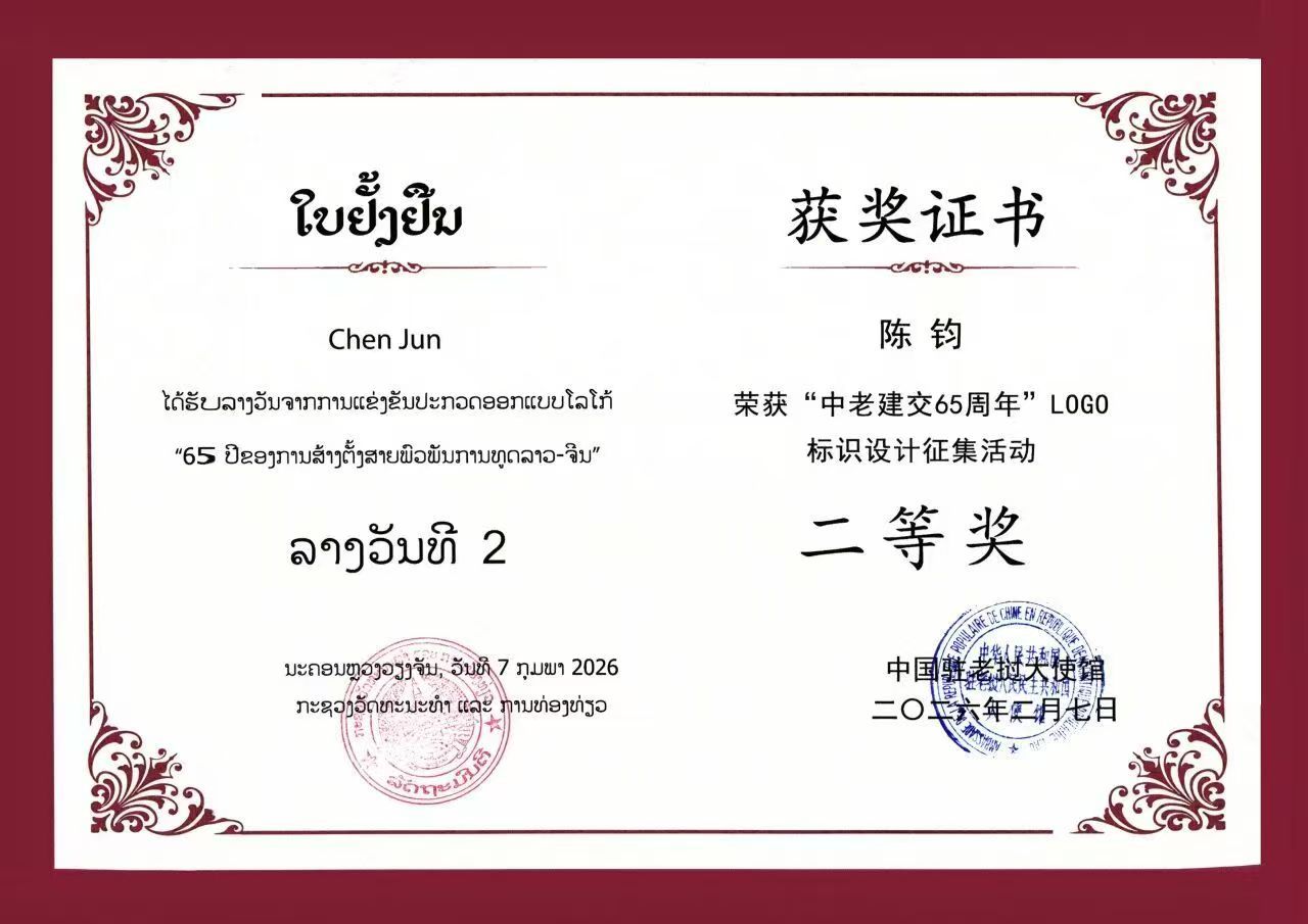 2026年迎来中老建交65周年,为深化中老文旅友好合作、厚植两国人民友谊,由中国驻老挝大使馆、老挝文化和旅游部主办,老挝中国文化中心承办的“2026中老建交65周年”标识(LOGO)设计征集活动评审结果于2026年2月6日正式揭晓,共11件作品获评等级奖。云南艺术学院设计学院视觉传达系陈钧老师创作的“庆祝中老建交65周年”标识,在本次征集活动中荣获二等奖。